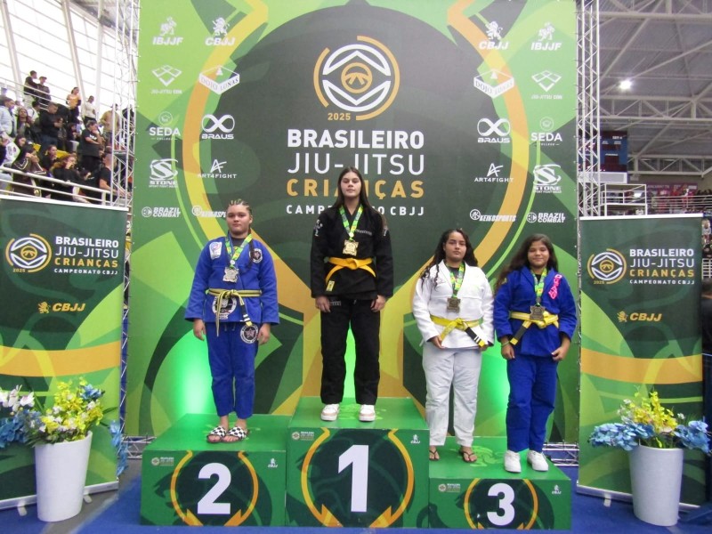 🥇 Moara Pereira – Campeã Brasileira de Jiu-Jítsu, categoria Infantojuvenil 1, faixa amarela, em Barueri-SP.