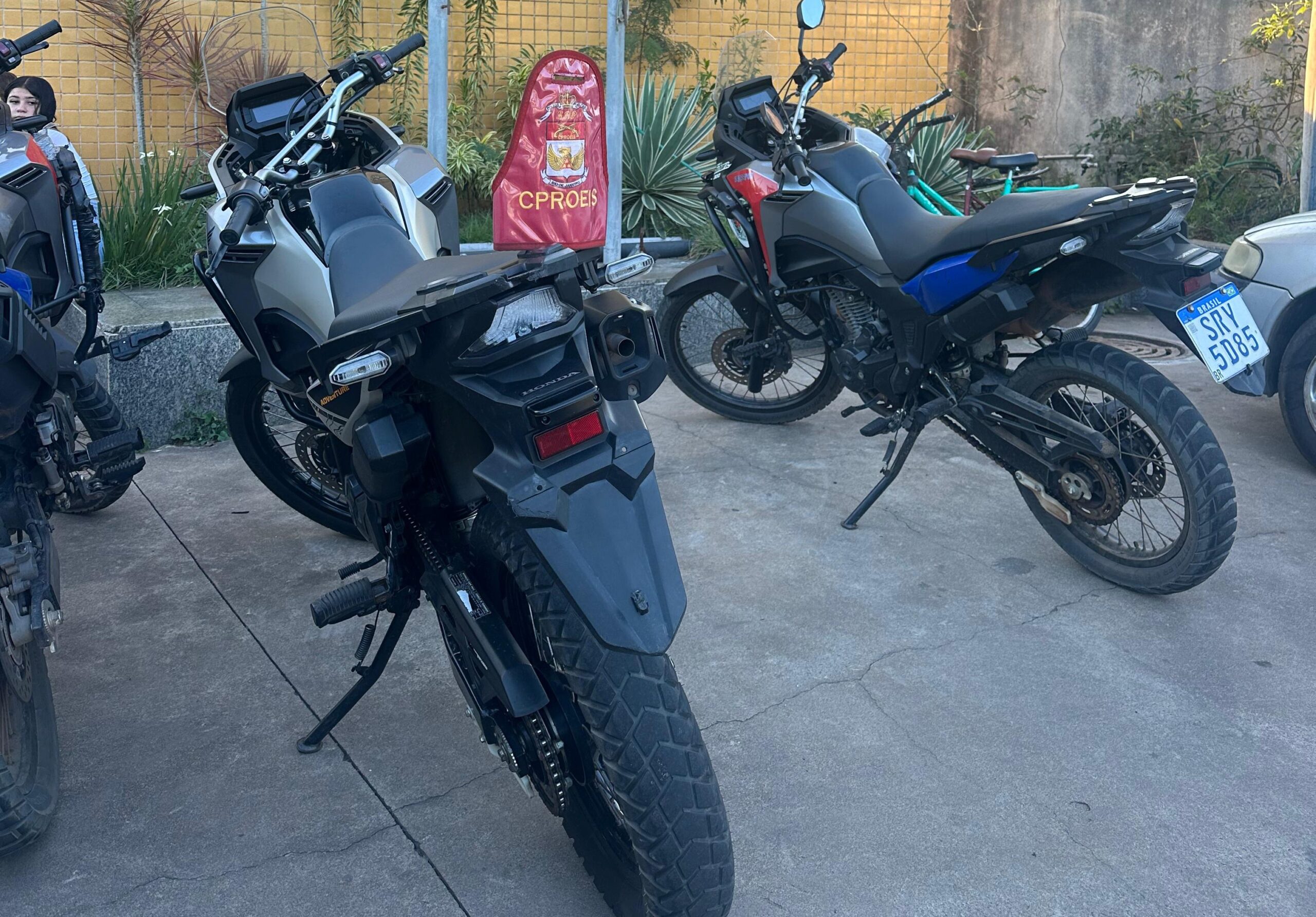 Durante o acompanhamento, os agentes constataram que a motocicleta não possuía placa de identificação visível. O veículo — uma Honda XRE 300 ADVENTURE FLEX, cor bege — foi abordado na Rua Antônio Alves da Silva. Na revista pessoal, foi encontrado com o condutor um recipiente contendo maconha e um cigarro da mesma substância.